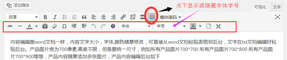 内容编辑跟word文档一样,内容文字大小,字体,颜色随意修改,可直接从word文档粘贴表格到后台,文字在txt文档编辑好粘贴后台。产品图片宽为700像素,高度不限,但是要统一尺寸,例如所有产品图片700*700 所有产品图片700*800 所有产品图片700*900等等,产品内容随意添加多张图片,产品内容编辑后台如下